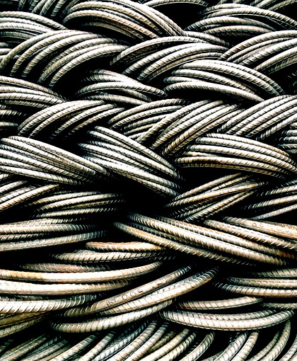 THigh-strength ribbed steel bars used for reinforcing concrete in construction.